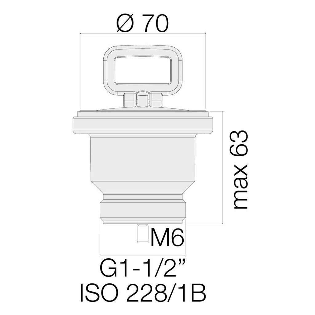 Der Ablauf ist für den Einbau in die Küchenspüle konzipiert: Er wird mit einem rechteckigen Standardkorb und einem Überlauf geliefert. Die Bohrung hat einen Durchmesser von 70 mm, während der Auspuff 1" 1/2 ist.