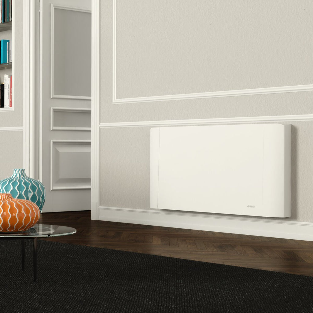 Der Frontkorpus besteht aus weiß lackiertem Metall (RAL 9003) , während die Seiten aus ABS mit anspruchsvoller Ästhetik („Smart Sides“) bestehen. Die Luft wird von unten angesaugt und von vorne durch ein motorisiertes mobiles Panel wieder zugeführt, das sich beim Einschalten des Geräts öffnet und beim Ausschalten schließt und mit Touch-Bedienelementen ausgestattet werden kann.