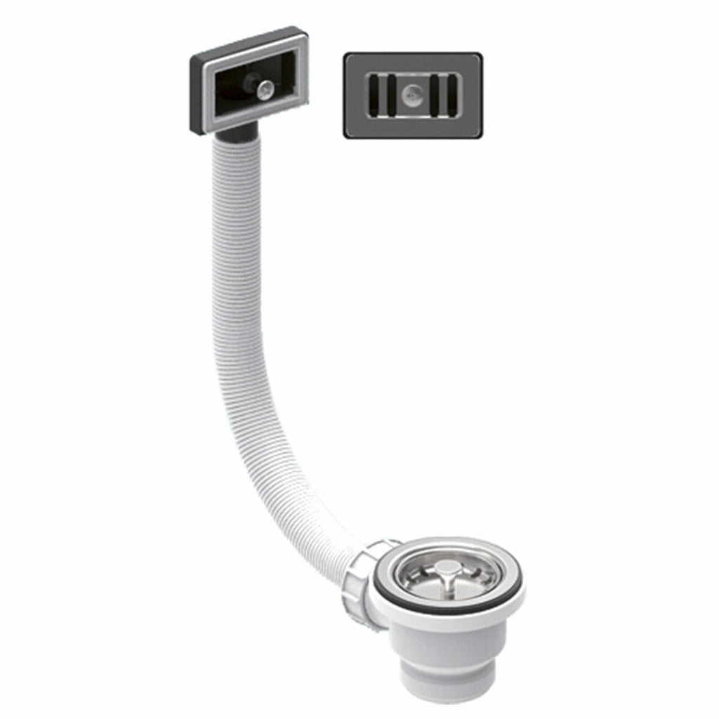 Der Ablauf ist für den Einbau in die Küchenspüle konzipiert: Er wird mit einem rechteckigen Standardkorb und einem Überlauf geliefert. Die Bohrung hat einen Durchmesser von 70 mm, während der Auspuff 1" 1/2 ist.