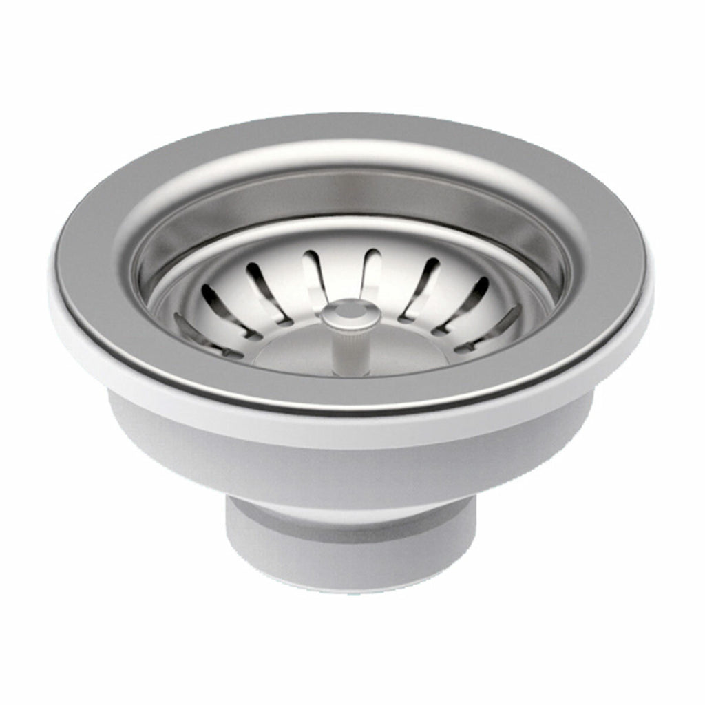 Der Ablauf ist für den Einbau in die Küchenspüle konzipiert: Er wird mit einem rechteckigen Standardkorb und einem Überlauf geliefert. Die Bohrung hat einen Durchmesser von 114 mm, während der Auspuff 3" 1/2 ist.