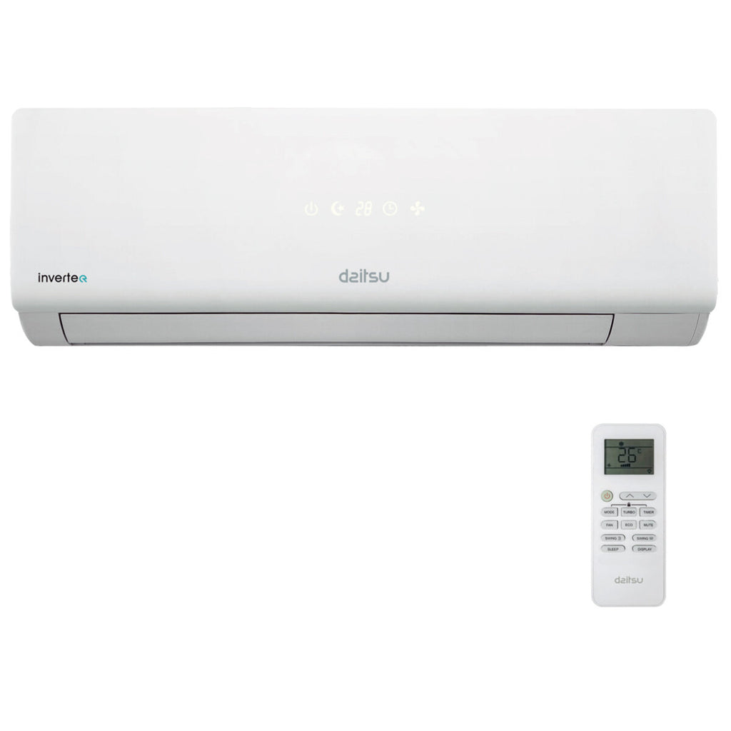 Die Dual-Split-Klimaanlage Daitsu ECO DT-2/3 überrascht durch ihre technischen und ästhetischen Eigenschaften zu einem vernünftigen Preis. Invertertechnologie, Verwendung von R32-Gas, Energieklasse A++. Frontplatte mit LED-Hintergrundbeleuchtung, ideal für zwei Räume mit jeweils 40 m2.