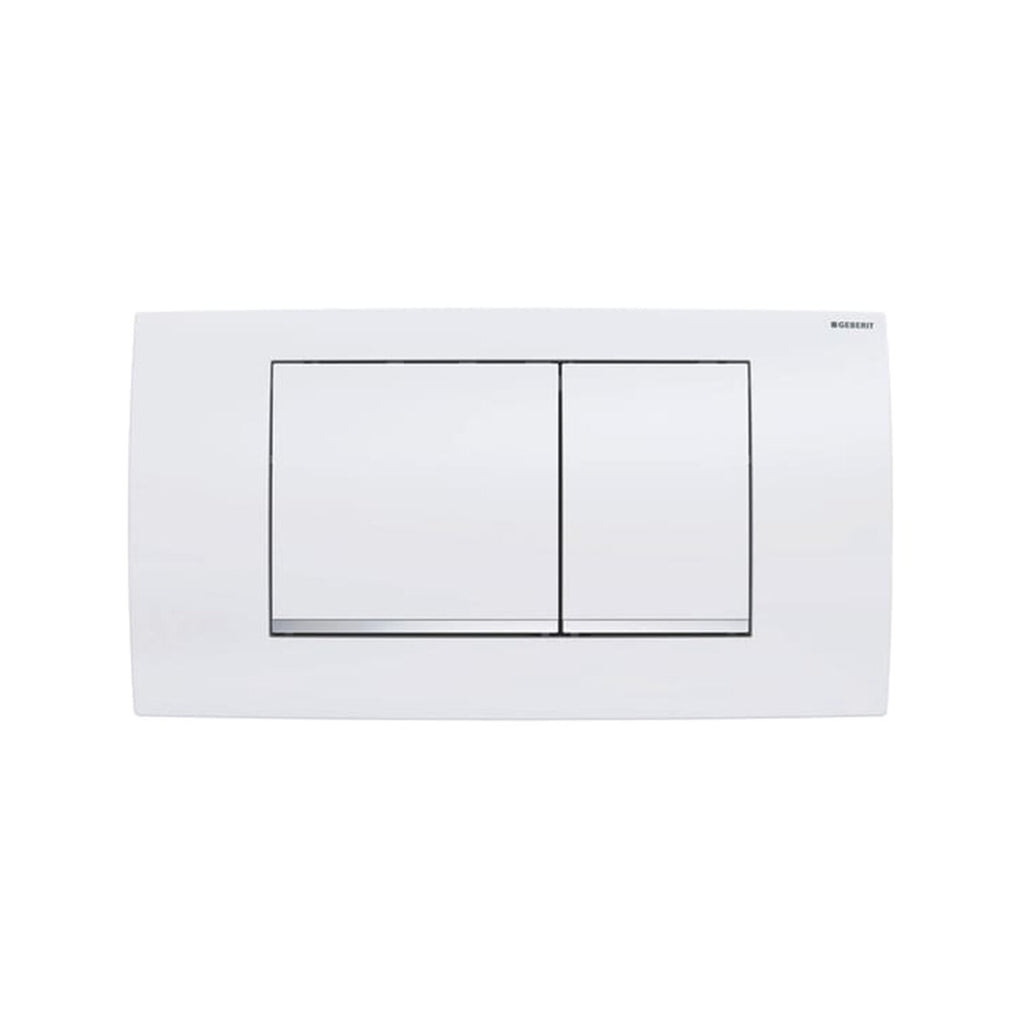 Geberit Twinline 30 weiße Betätigungsplatte mit doppelter quadratischer Taste und poliertem Chromrahmen. Geeignet für alle, die klassische Badmöbel lieben, ohne auf Funktionalität und Qualität zu verzichten.