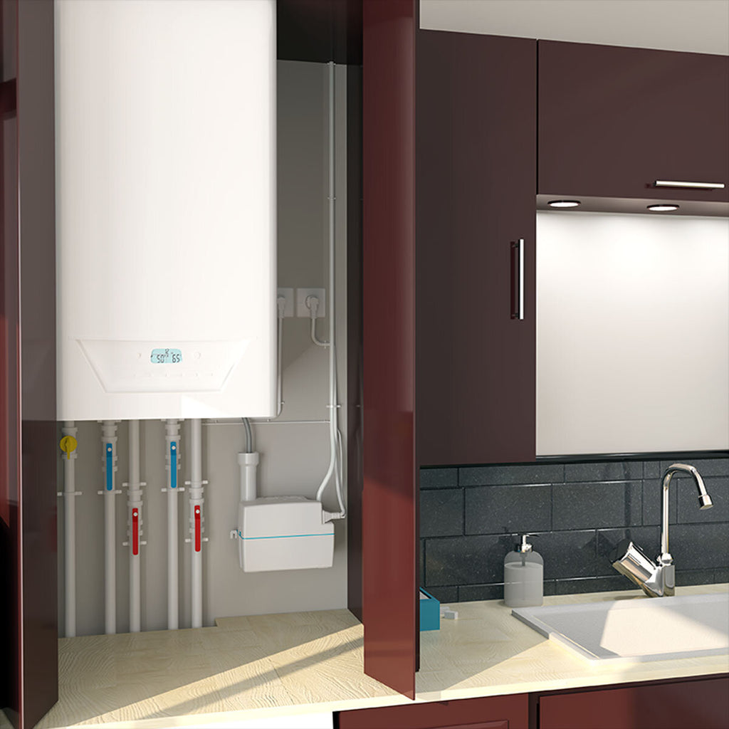 La mini pompe Sanicondens Pro V.02 est équipée d'un moteur capable d'évacuer les condensats des chaudières à gaz jusqu'à 50 kW et des chaudières diesel jusqu'à 30 kW avec des températures de condensation jusqu'à 80 °C . Pour une utilisation avec des chaudières à condensation, Sanicondens Pro V.02 doit être associé au neutralisant de condensats acides Sanineutral (code SANINEUT), également disponible sur Climamarket.